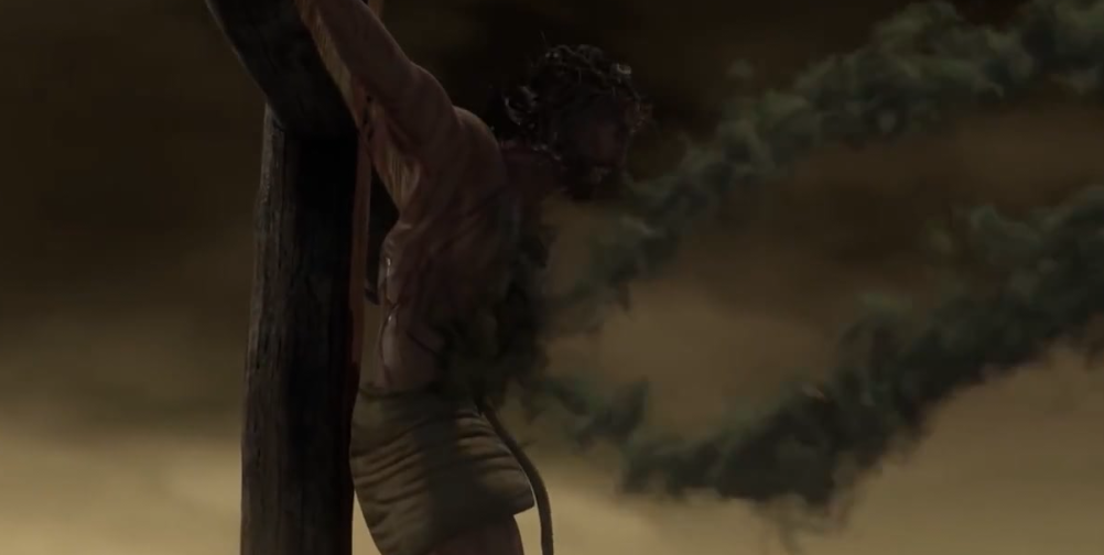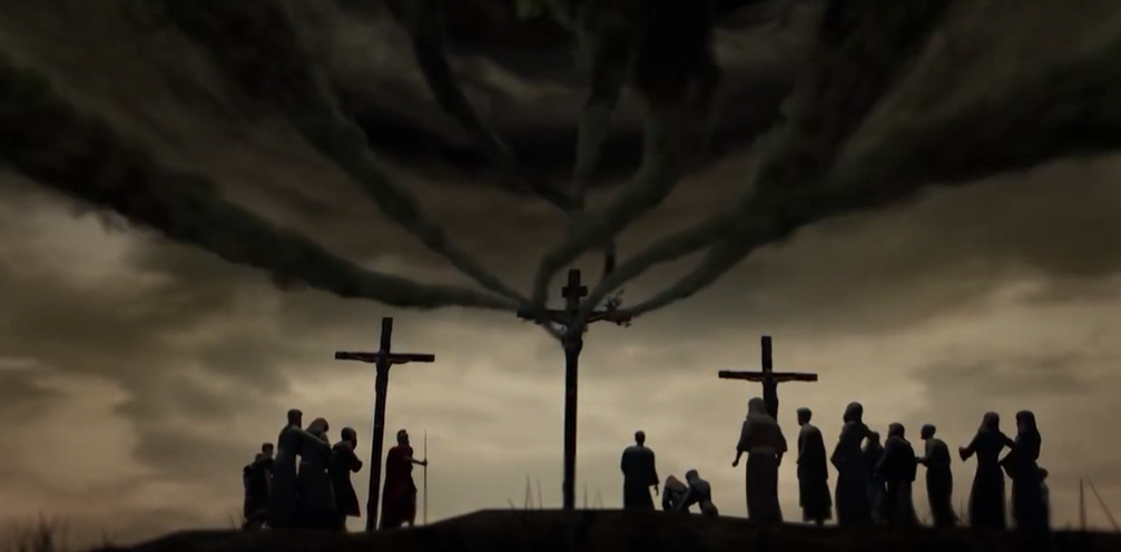 Ezt 6 nappal a páska ünnepe előtt történt. Akkor ugyanis a Sátán – akinek végig bejárása volt a mennybe – ki lett onnan utasítva. Az Ördög a nagy feje és hirtelen haragja miatt bosszút állt Isten Fián a Messiáson. Minden erejét összeszedte és felvonultatta a keresztre szegezett Krisztus ellen. Az embereket elhagyták a bűnök, a betegségek, az átkok, a halál, a szegénység erői. Jöttek a test nélküli démonok, a gonosz angyalok és mindenki aki a gonoszság táborához tartozott. Olyan nagy sokaság, hogy beborították az eget a Golgota felett. Sötét lett.